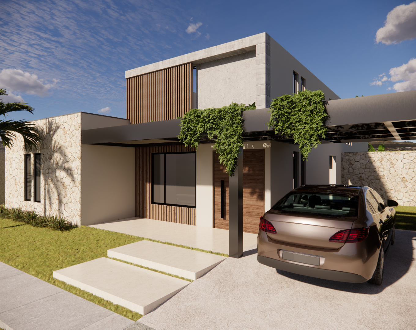 Con una superficie de 140 m², el modelo Elani cuenta con 3 dormitorios, 3 baños, una sala de estar y comedor integrados, cocina equipada, lavandería, walk-in closet y una terraza exterior. Este diseño ofrece un espacio acogedor y funcional para familias que buscan simplicidad y confort.